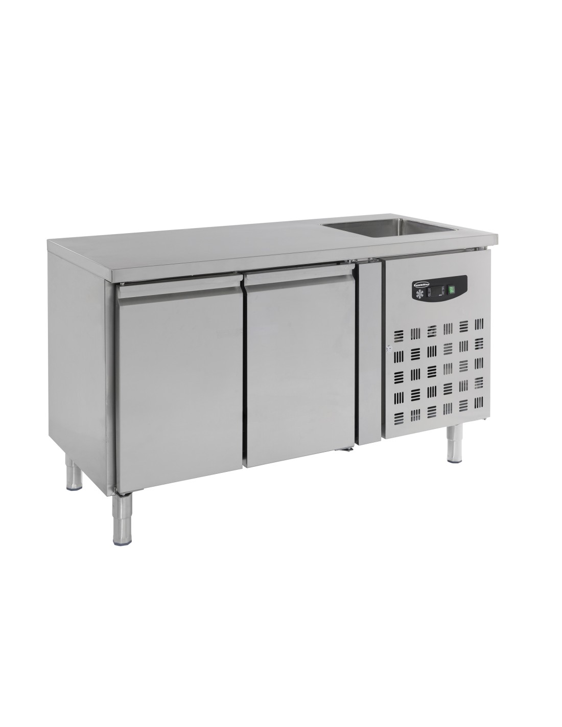 **700 TABLE RÉFRIGÉRÉE PLONGE 2 PORTES : table pro 282 L, inox 18/8 ext., inox 201 int., +2°C à +8°C, R290, 2 portes et 2 grilles GN 1/1, dégel automatique.**