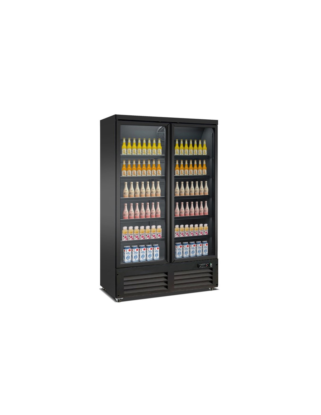 Réfrigérateur 2 portes en verre noir CEB-1200R BL, 1 000 L, réfrigération ventilée 0–10 °C, visibilité accrue, éclairage LED et efficacité énergétique.