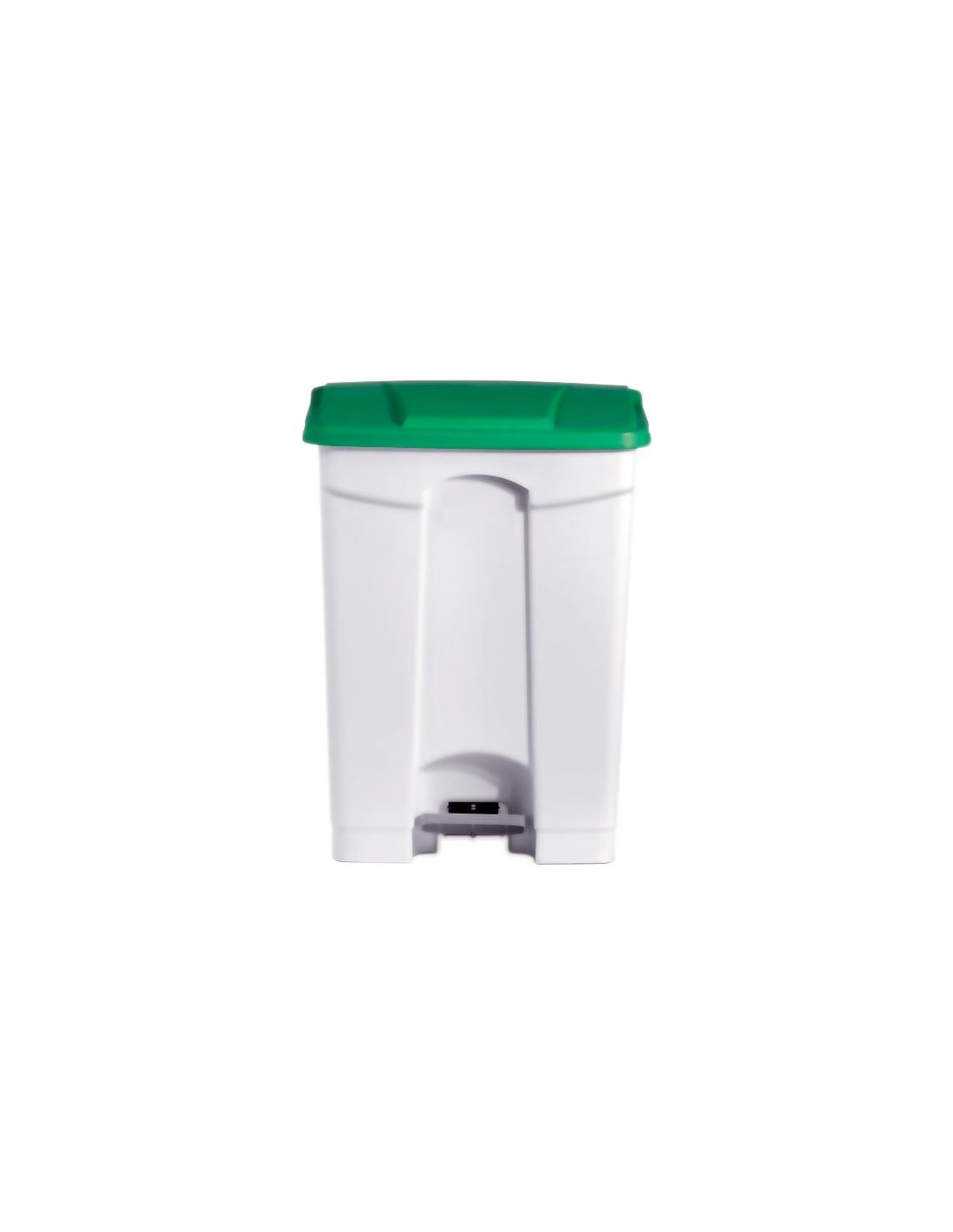 POUBELLE BLANCHE POLYPROPYLENE 90L COUVERCLE VERT ROULANTE. COUVERCLE VERT L (en mm) : 500 - P (en mm) : 410 H (en mm) : 820